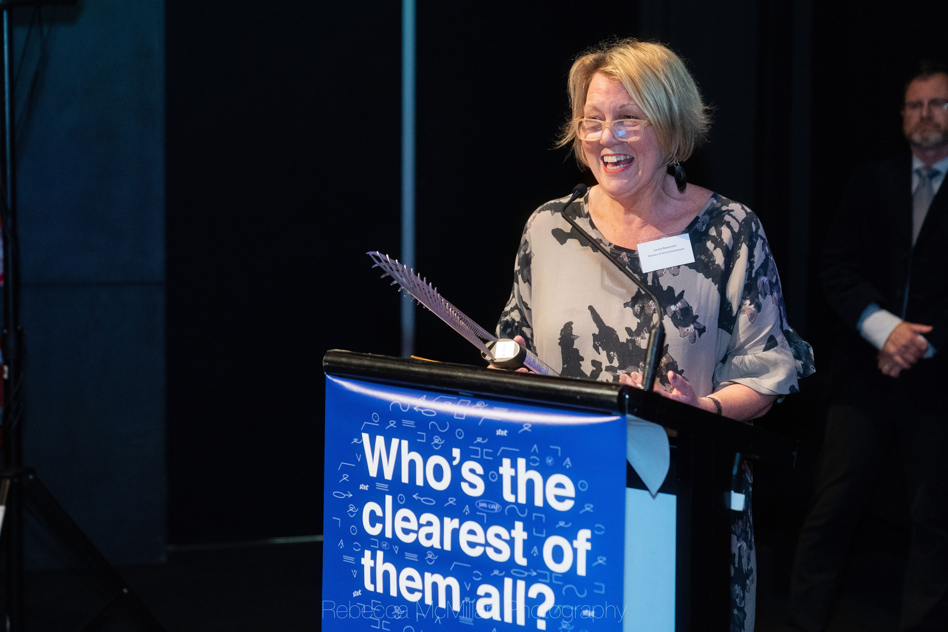 Louise Beaumont from MSD's Better Letters Project gives her acceptance speech. Photo by Rebecca McMillan.